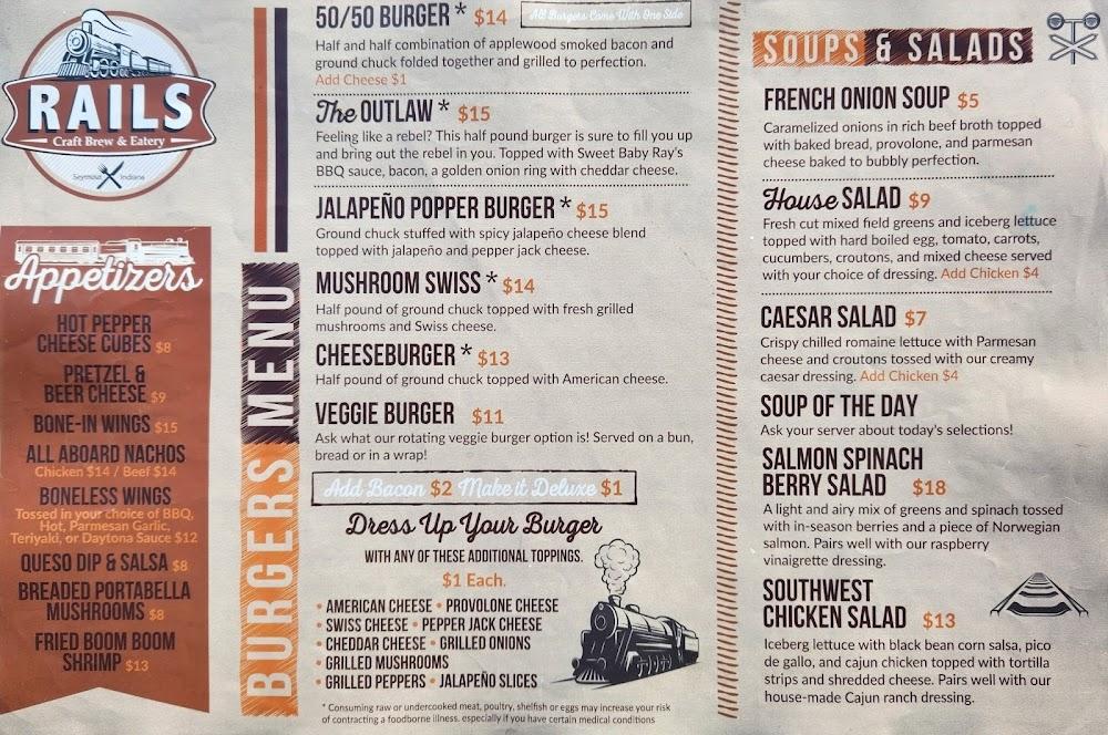 Welcome to Rails Craft Brew & Eatery, your go-to destination in downtown Seymour, Indiana, since May 2015. We pride ourselves on offering a delightful menu filled with American favorites, including juicy burgers, wraps, steaks, and fresh salads. Our commitment to healthy eating shines through with options like the Salmon Spinach Berry Salad and unique house-made veggie burgers. Join us for lively events featuring local musicians, karaoke, and trivia on our inviting patio. Enjoy the cozy atmosphere, excellent cocktails, and an extensive selection of craft beers. Follow us on Facebook and Instagram for updates and specials—thank you for supporting local!